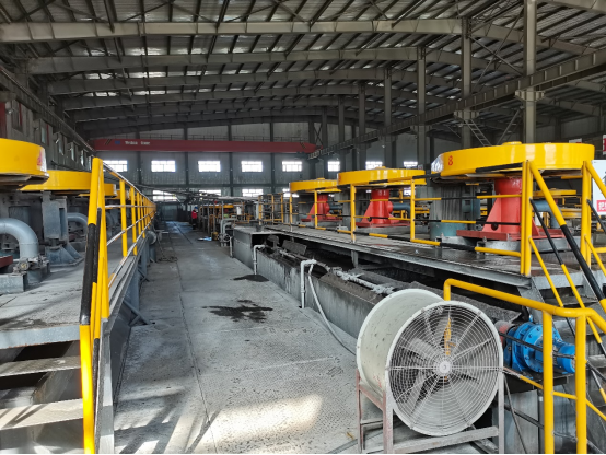 選廠磨礦機配制為3臺,均使用國產中信重工球磨機。工藝為原礦一段閉路磨礦、鉛粗精礦閉路磨礦和鐵粗精礦閉路磨礦。原礦一段閉路磨礦采用5064球磨機,聯合一組6臺φ500旋流器組成閉路系統。磨礦機單位體積-200目生產能力大,磨礦效率高,最終磨礦產品-200目含量大于75%。自動保護系統齊全,同時配備磨音監控系統,對整個磨礦機工作狀態實時監控。自動化程度高,有北礦院生產的在線粒度分析儀,可以做到對磨礦產品粒度組成的實時顯示,有利于生產的穩定。鉛粗精礦再磨工藝使用的是一臺2445球磨機,同時配備一組6臺φ150旋流器。鐵粗精礦再磨工藝使用的是2775球磨機,一同時配備一組16臺φ150旋流器。再磨細度高,-325目占比大于95%。