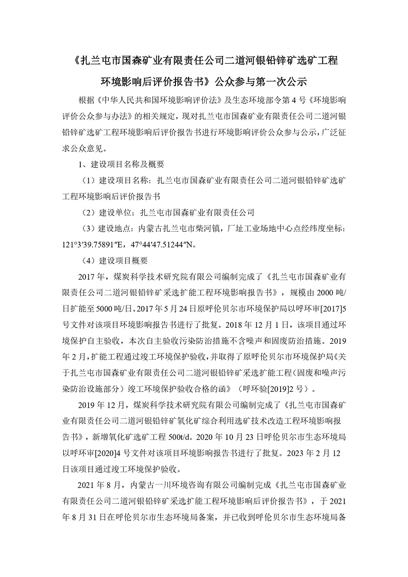 《扎蘭屯市國森礦業有限責任公司二道河銀鉛鋅礦選礦工程環境影響后評價報告書》公眾參與第一次公示